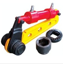 NJS大功率液壓扳手、液壓扭矩扳手:由液壓泵和帶棘輪式液壓扭矩扳手兩部分組成。操縱液壓泵的手柄,液壓缸產(chǎn)生推力,經(jīng)過曲柄系統(tǒng)形成力矩,帶動螺母轉(zhuǎn)動一個角度,使扭矩傳遞到帶棘輪裝置的內(nèi)六角套筒上從而傳遞給螺栓聯(lián)接,按要求預(yù)緊螺栓。液壓泵由操縱手柄,高壓泵、換向閥、油箱、壓力表和帶快速接頭的輸油管等組成。帶棘輪式液壓扳手由高壓油口、液壓油缸、曲柄、反力桿、棘輪裝置、套筒等組成、前者系動力源部件,后者為扭矩執(zhí)行機構(gòu)。比較準(zhǔn)確的控制擰緊扭矩的理想工具,廣泛應(yīng)用于水電廠,熱電廠,煉油廠,化肥廠,造船廠,鋼鐵廠,化工廠,石油開采業(yè),設(shè)備安裝業(yè),采礦業(yè)機械設(shè)備和設(shè)施重要螺栓聯(lián)接的安裝及拆卸維修